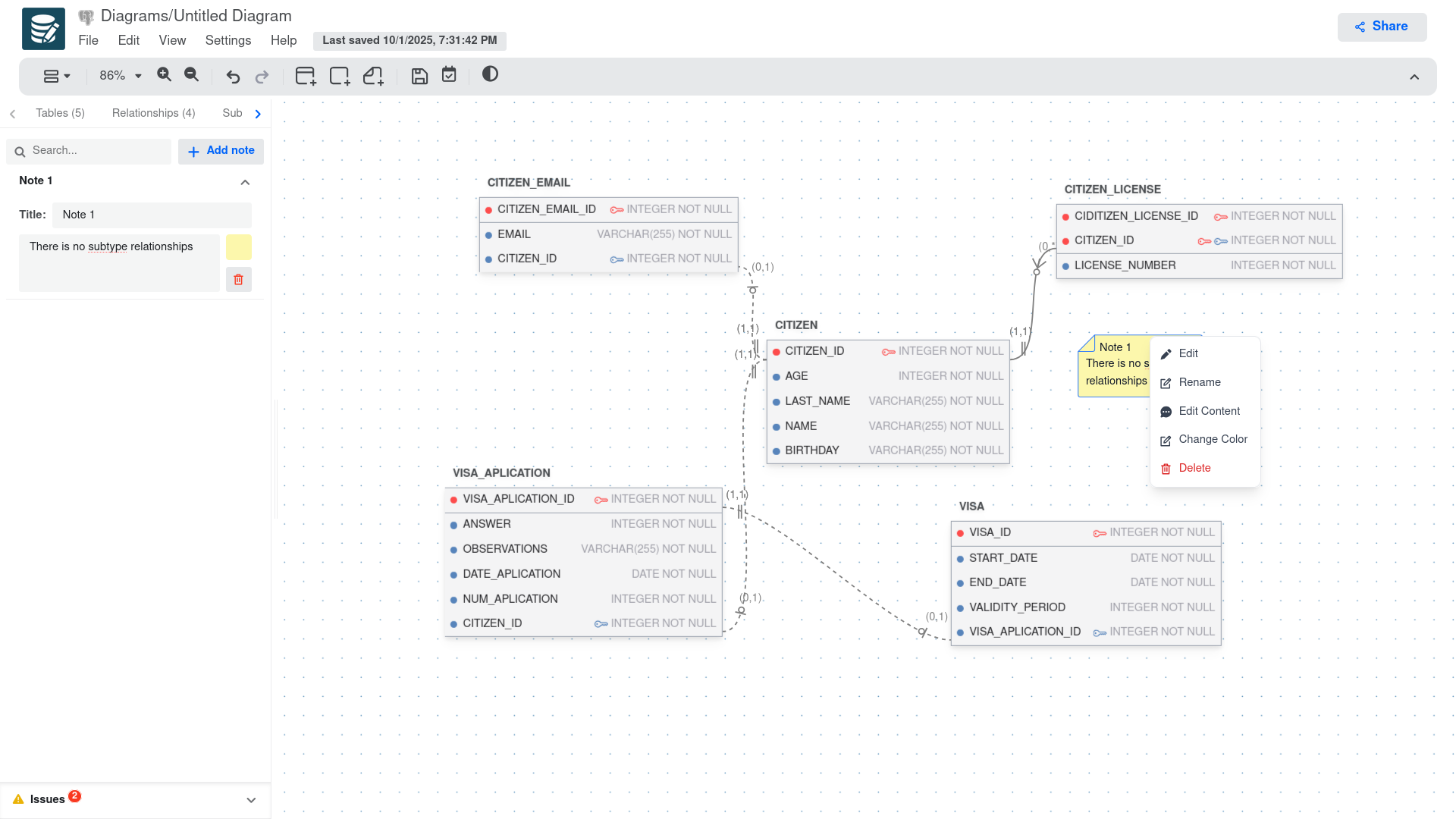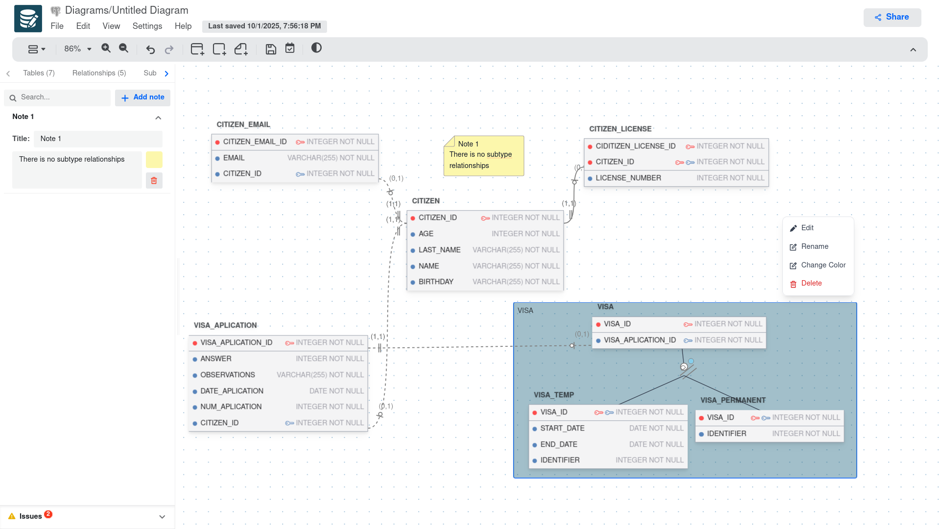 | Relationship Type | Opens a submenu to change the type of relationship (one-to-one, one-to-many and subtype). |